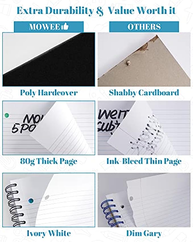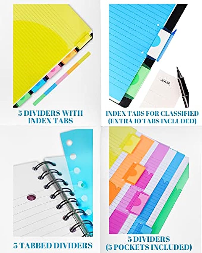 • MULTIFUNCTIONAL NOTEBOOK: MOWEE 5 Subject notebook with 5 movable color code storage dividers. Easy for organizing your school assignments, your office worksheets, and business notes. 10 pieces of extra tabs are provide for replacement.